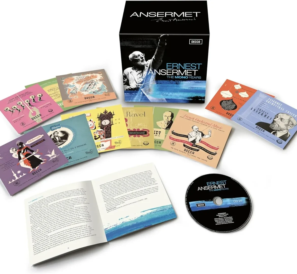 The box sets also reveals the breadth of the Swiss conductor’s repertoire, which goes far beyond the French and Russian. In the 1960s, Decca also recorded Haydn, Mendelssohn, Schumann, and complete cycles of Beethoven’s and Brahms’s symphonies with Ansermet and his Swiss orchestra. Sibelius’s Second and Fourth Symphonies appear as well, somewhat unexpectedly. The Haydn Paris Symphonies are given with an ideal mix of elegance and vital drive. The Beethoven and Brahms interpretations, while not among the very greatest, stand out for a freshness that distinguishes them within the vast number of recordings on the market.