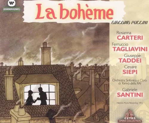 Gabriele Santini’s 1952 Cetra recording with the Italian Radio Orchestra in Turin is greatly underrated. His interpretation has a natural warmth and a true feel for Puccini’s musical language. Rosanna Carteri is one of the best Mimis on record, with brilliance, elegance, and sensitivity in her singing. Ferruccio Tagliavini gives a passionate and intense Rodolfo. There are also major singers like Giuseppe Taddei and Cesare Siepi as Marcello and Colline, even if Elvira Ramella’s Musetta is a little too piercing. The mono sound is perfectly acceptable, though the levels can vary a bit.